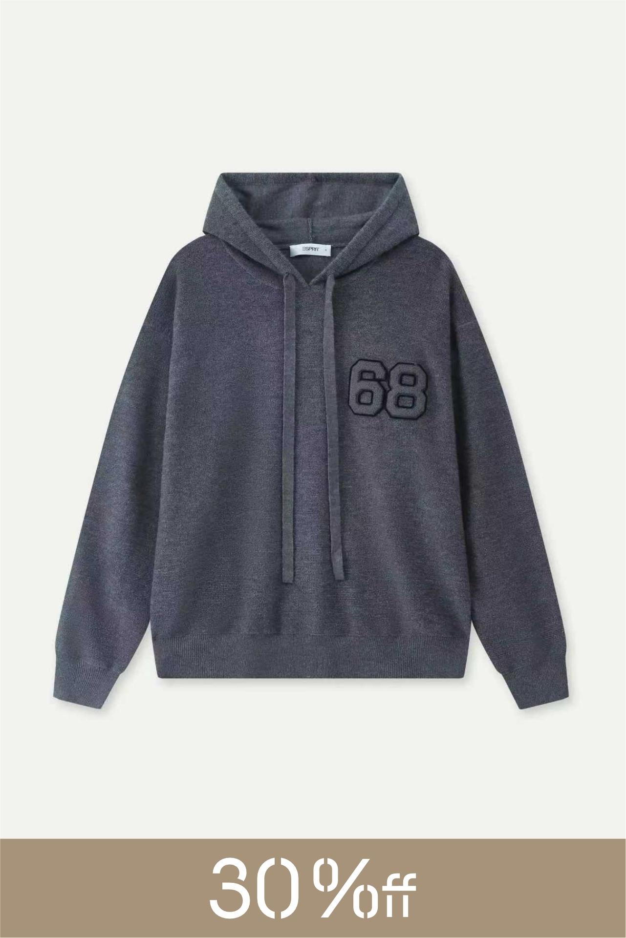 This hoodie knit sweater combines casual comfort with a sporty touch. Designed with a relaxed silhouette, it features a classic hood with adjustable drawstrings and a soft knit construction for everyday wear. The subtle “68” patch detail on the chest adds a collegiate-inspired accent, while ribbed cuffs and hem provide a clean, comfortable finish. An easy layering piece that works effortlessly for casual and off-duty styling.